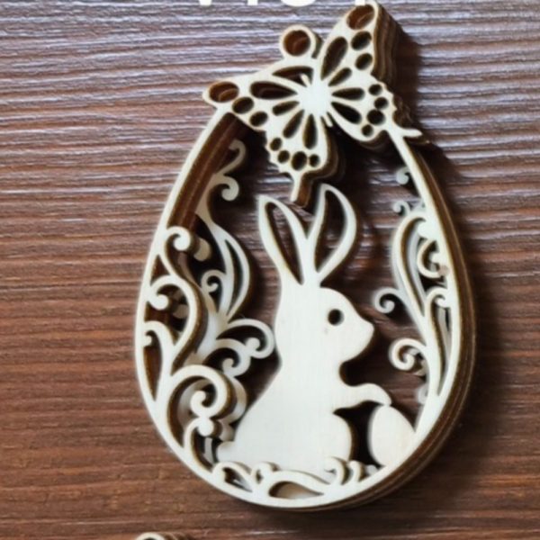 Ez a különleges 3 rétegű tojás függődísz 3 mm-es rétegelt lemezből készült, minőségi lézergravírozással és füstmentes, precíz lézervágással. Három rétegben épül fel, melyek finoman kidolgozott, áttört mintákat rejtenek: a középső rétegen egy bájos nyuszi, mellette egy tojás és indamotívumok láthatók, míg felül egy elegáns pillangó díszíti. A tetején lévő akasztólyuknak köszönhetően könnyedén felakasztható. Ideális húsvéti dekoráció, ajtódísz, vagy tavaszi hangulatot teremtő kiegészítő.