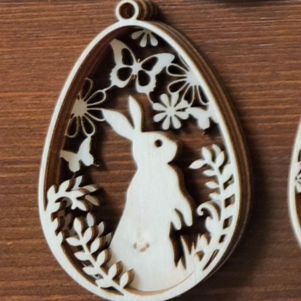Ez a tavaszi hangulatú 3 rétegű tojás függődísz 3 mm-es rétegelt lemezből készült, minőségi lézergravírozással és füstmentes, precíz lézervágással. Három rétegben épül fel, melyek finoman kidolgozott, áttört mintákat rejtenek: a középső rétegen egy bájos, felálló nyuszi látható, virágok és növényi indák között, a felső részen pedig két pillangó díszíti. A tetején lévő akasztólyuknak köszönhetően könnyedén felakasztható. Ideális húsvéti dekoráció, tavaszi hangulatot teremtő kiegészítő, vagy egyedi ajándék.