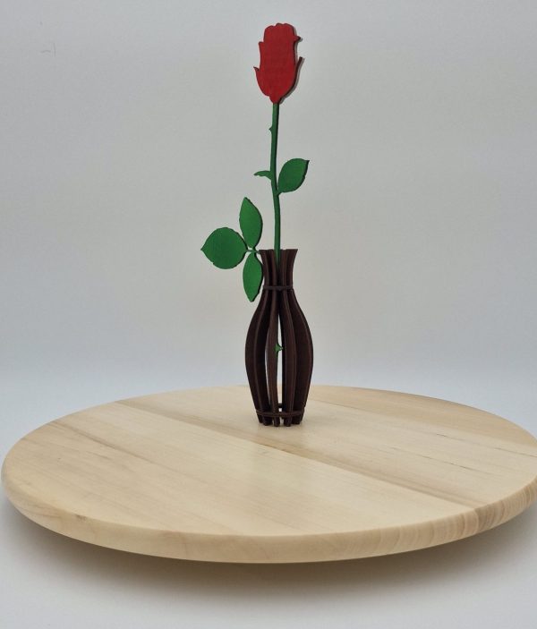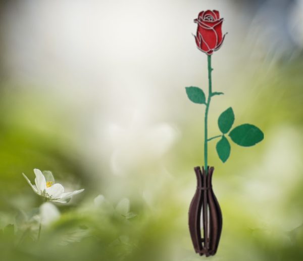 A rózsa és a váza egyaránt kiváló minőségű, 3 mm vastag rétegelt lemezből készül, amely természetes és kifinomult megjelenést kölcsönöz. A gyártási folyamat során minőségi lézergravírozást alkalmazunk a rózsaszirmok és levelek finom részleteinek kiemelésére, valamint precíz, füstmentes lézervágást a tökéletes forma és illeszkedés érdekében. Az elemek gondos összeállítása biztosítja a termék stabilitását és esztétikus megjelenését.