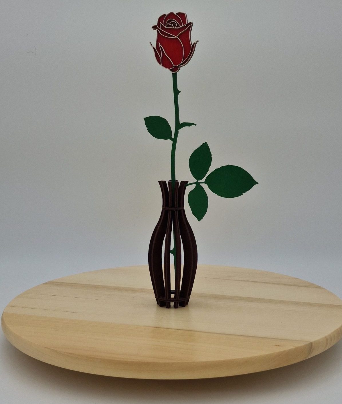 A rózsa és a váza egyaránt kiváló minőségű, 3 mm vastag rétegelt lemezből készül, amely természetes és kifinomult megjelenést kölcsönöz. A gyártási folyamat során minőségi lézergravírozást alkalmazunk a rózsaszirmok és levelek finom részleteinek kiemelésére, valamint precíz, füstmentes lézervágást a tökéletes forma és illeszkedés érdekében. Az elemek gondos összeállítása biztosítja a termék stabilitását és esztétikus megjelenését.