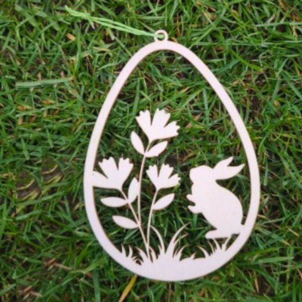 - Design: A függődísz tojás formájú, belsejében egy aranyos kis nyuszi látható, amint egy virágos mezőben szaladgál. A mintázat áttört, ami lehetővé teszi, hogy a fény átszűrődjön rajta, így különleges árnyékokat vetít a falra vagy a padlóra. A nyuszi és a virágok kombinációja a tavasz és a megújulás érzetét kelti.
