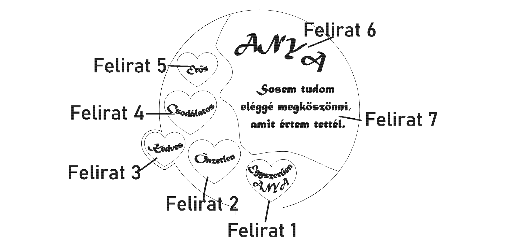 Egyedi jelentéstartalom: Az öt darab kivágott szívben olyan szavak szerepelnek, mint Erős, Csodálatos, Kedves, Önzetlen és Egyszerűen ANYA.