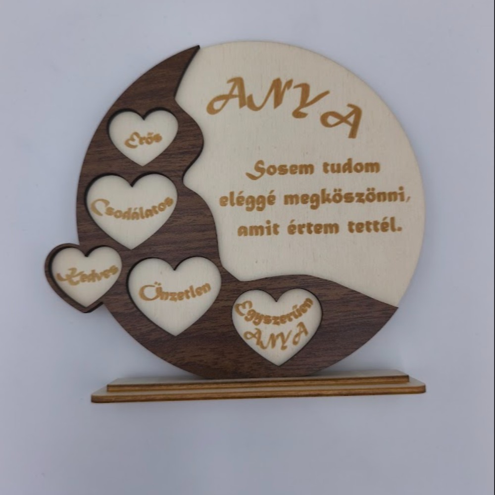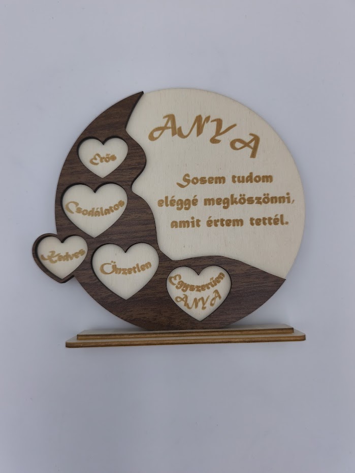 Vannak ajándékok, amelyek többet mondanak minden szónál. Ez a kézműves asztali dísz azért született, hogy emlékeztesse az édesanyákat arra, mennyire fontosak és csodálatosak. A kétrétegű, kontrasztos (világos és sötétbarna) rétegelt lemez kombinációja modern, mégis természetes megjelenést kölcsönöz a lakás bármely pontjának.