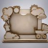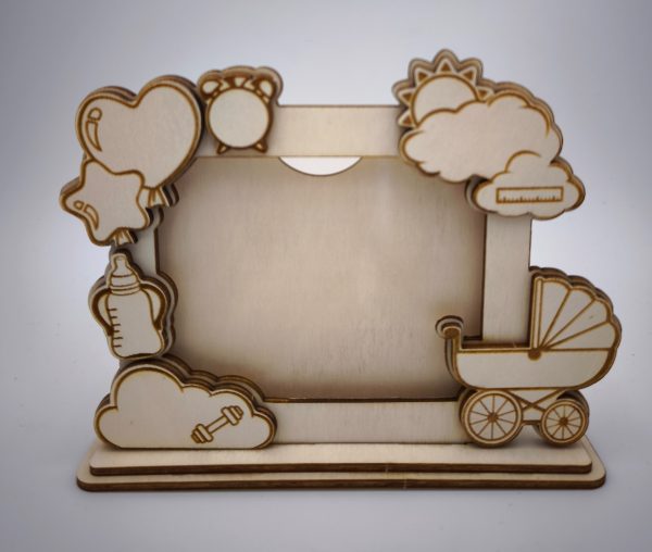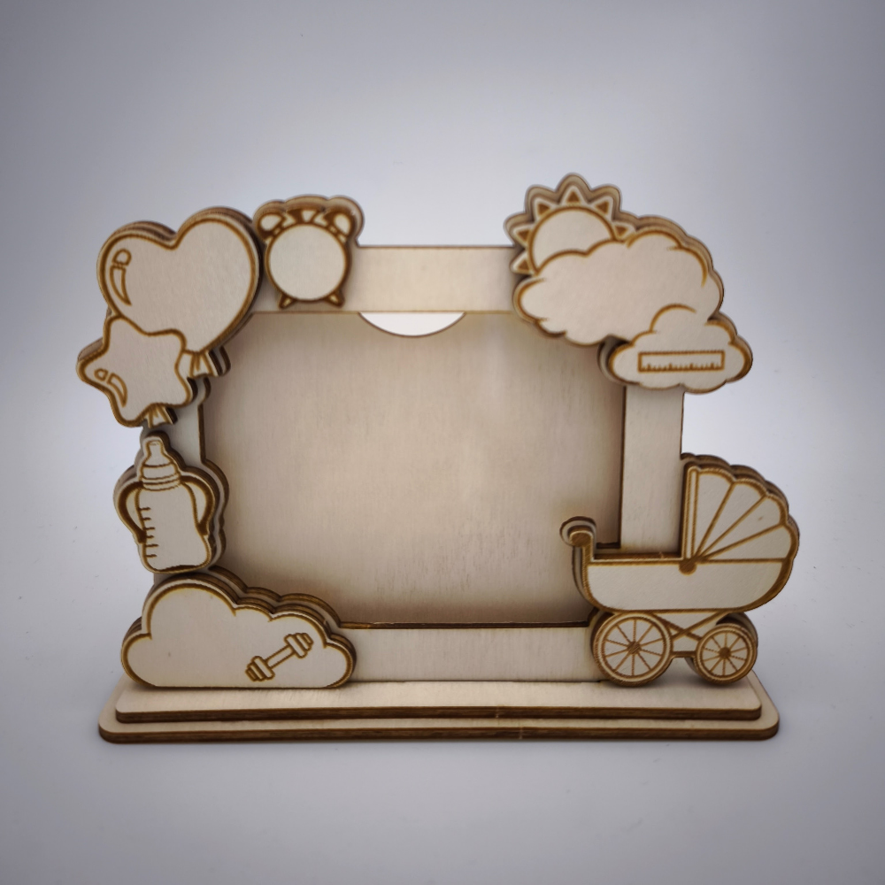 Örökítse meg kisbabája érkezésének legfontosabb adatait ezzel a prémium, 3 mm-es rétegelt lemezből készült asztali képkerettel! A precíz, füstmentes lézervágással készült díszt bájos babakocsi, lufik, felhők és cumisüveg minták teszik teljessé. A születési adatok (súly, idő, méret) az egyedi ikonokba kerülnek gravírozásra, a baba nevét pedig az Ön által kért helyen tüntetjük fel. Természetes és szívhez szóló ajándék minden újdonsült család számára.