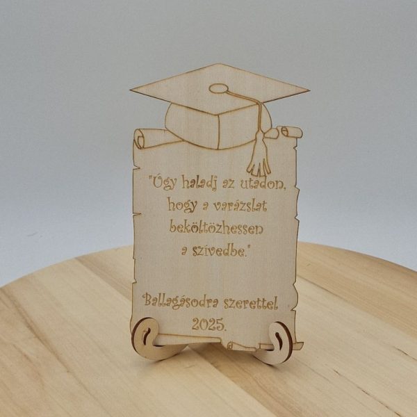 - Design és funkció: A termék egy oklevélre emlékeztető táblából áll, melynek tetején egy ballagási sapka látható. Az oklevélen egy meghitt idézet kapott helyet: „Úgy haladj az utadon, hogy a varázslat beköltözhessen a szívedbe.”, alatta pedig a felirat „Ballagásodra szeretettel 2025.” szerepel. A tartó a két kis alsó ív segítségével stabilan megáll az asztalon, polcon vagy komódon.