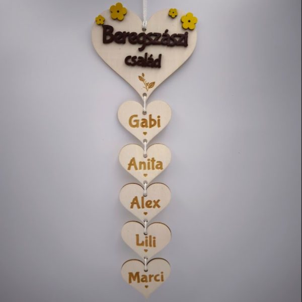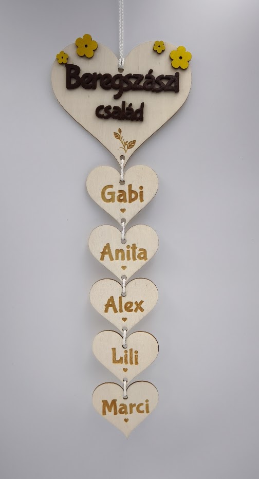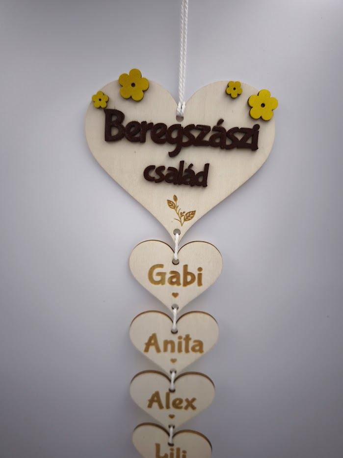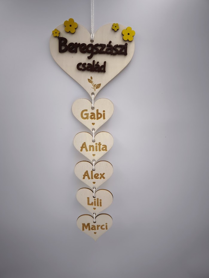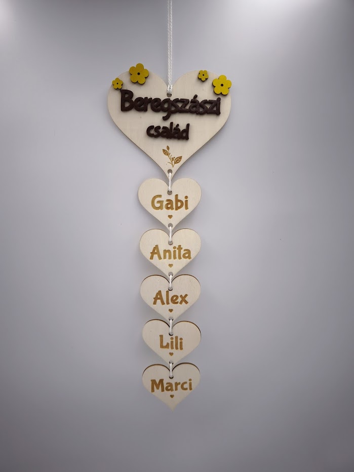 Hozza közelebb egymáshoz a családtagokat ezzel a gyönyörű, rétegelt lemezből készült családi függődísszel! A nagyméretű központi szív a családnevet hordozza, míg az alatta sorakozó kisebb szívek a családtagok neveit örökítik meg. A precíz, füstmentes lézervágás és a minőségi gravírozás garantálja az elegáns megjelenést. A termék alapcsomagja 5 darab kisméretű szívet tartalmaz, de igény szerint további szívekkel is bővíthető.