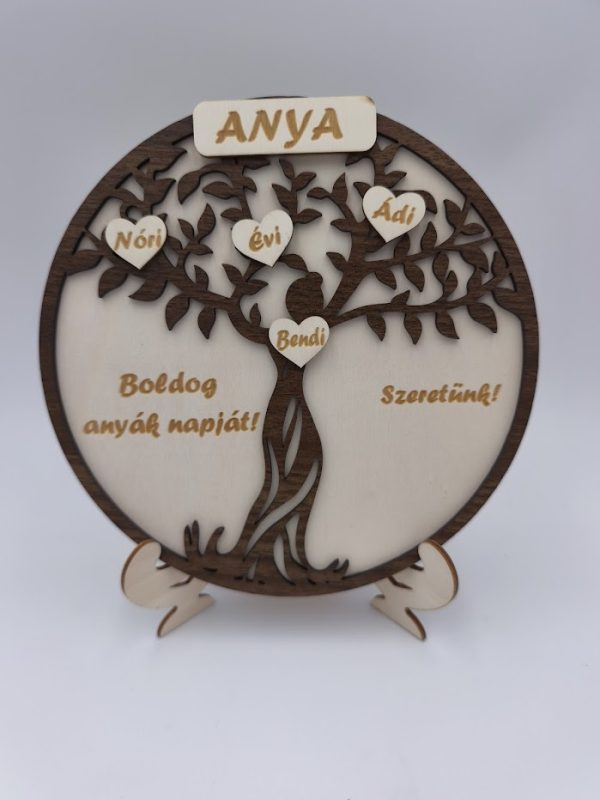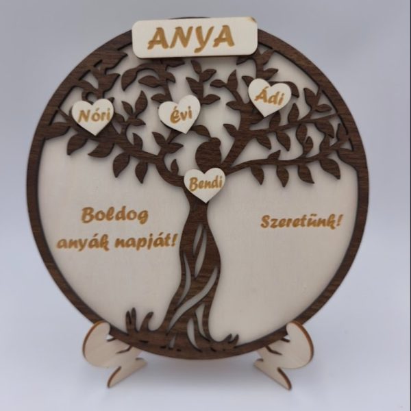 Varázsolja otthonába a családi összetartozás jelképét ezzel az egyedi, rétegelt lemezből készült életfa dísszel! A termék minőségi lézergravírozással és precíz vágással készül, füstmentes kivitelben. Egyedi nevekkel és felirattal kérhető, a csomag pedig tartalmazza a praktikus tartó állványt is. Ideális, szívhez szóló ajándék minden alkalomra.