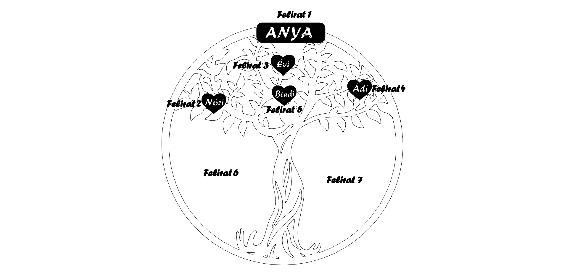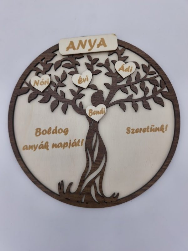 Személyre szabhatóság: A termék egyedi névvel és felirattal kérhető. Te határozod meg a felső névtábla tartalmát, a faágakon lévő szívek neveit, valamint az alsó köszöntő szöveget is.
