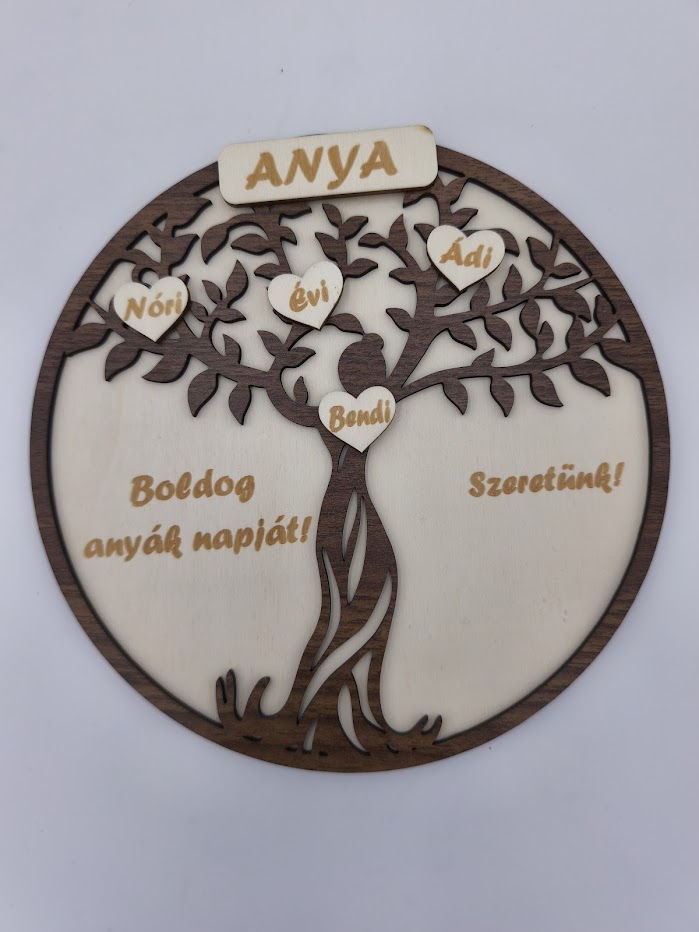 Vannak ajándékok, amelyek nemcsak a lakást díszítik, hanem a szívet is melengetik. Ez az egyedi, kétrétegű asztali dísz a család egységét és az élet folytonosságát szimbolizálja az életfa motívumán keresztül. A sötétebb tónusú, finoman kidolgozott faágak között megbújó kis szívek a legfontosabb személyek neveit hordozzák, így alkotva egy kerek egészet.