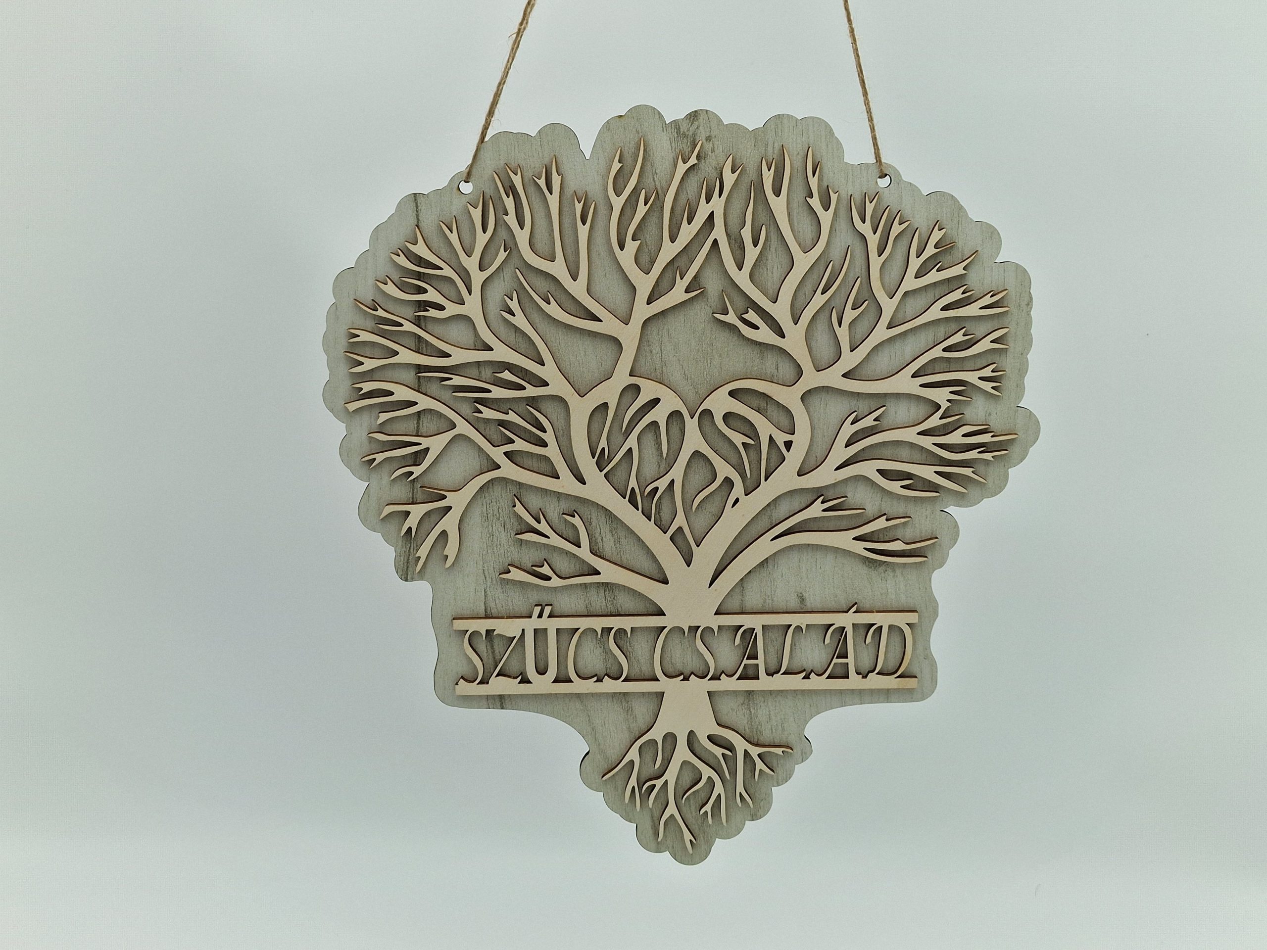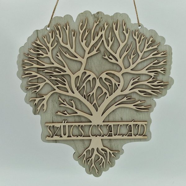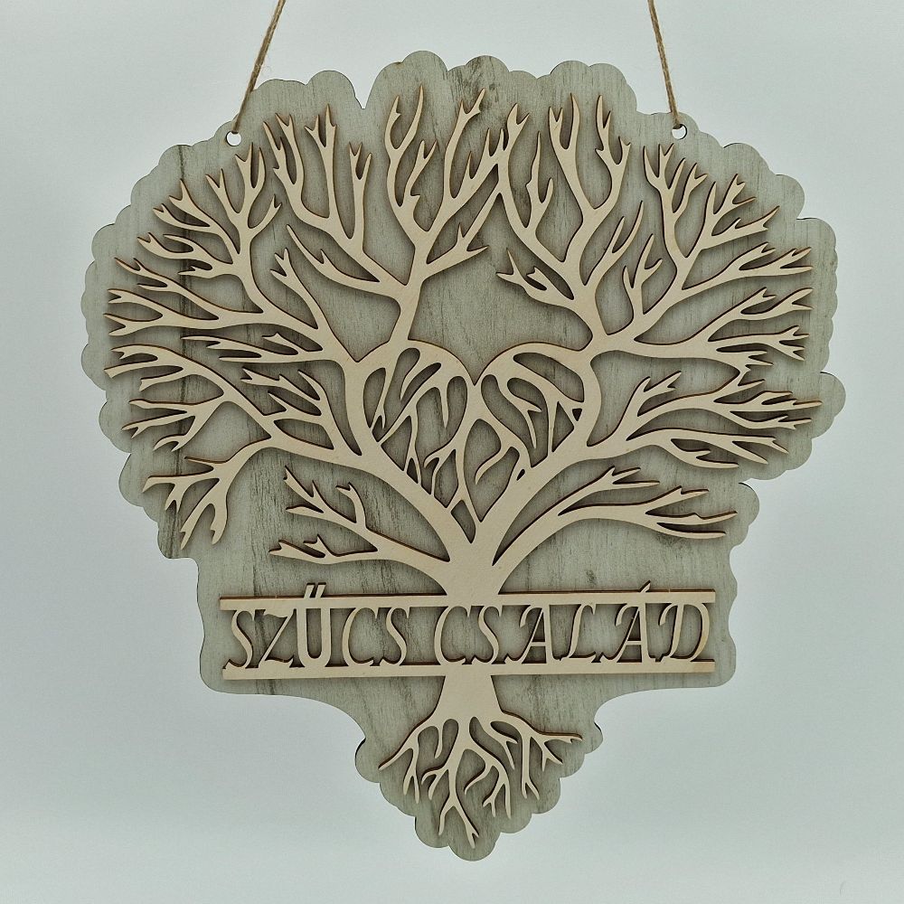 Ez a gyönyörű Családi Életfa egyedi és meghitt dísze lehet otthonának. A 3 mm-es rétegelt lemezből készült életfa ágai alatt egyedi lézergravírozással szerepelhet a család neve, ahogy a képen a „SZŰCS CSALÁD” felirat is látható. A precíz, füstmentes lézervágással és minőségi gravírozással készült dísz mérete kb. 30×28 cm.