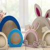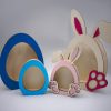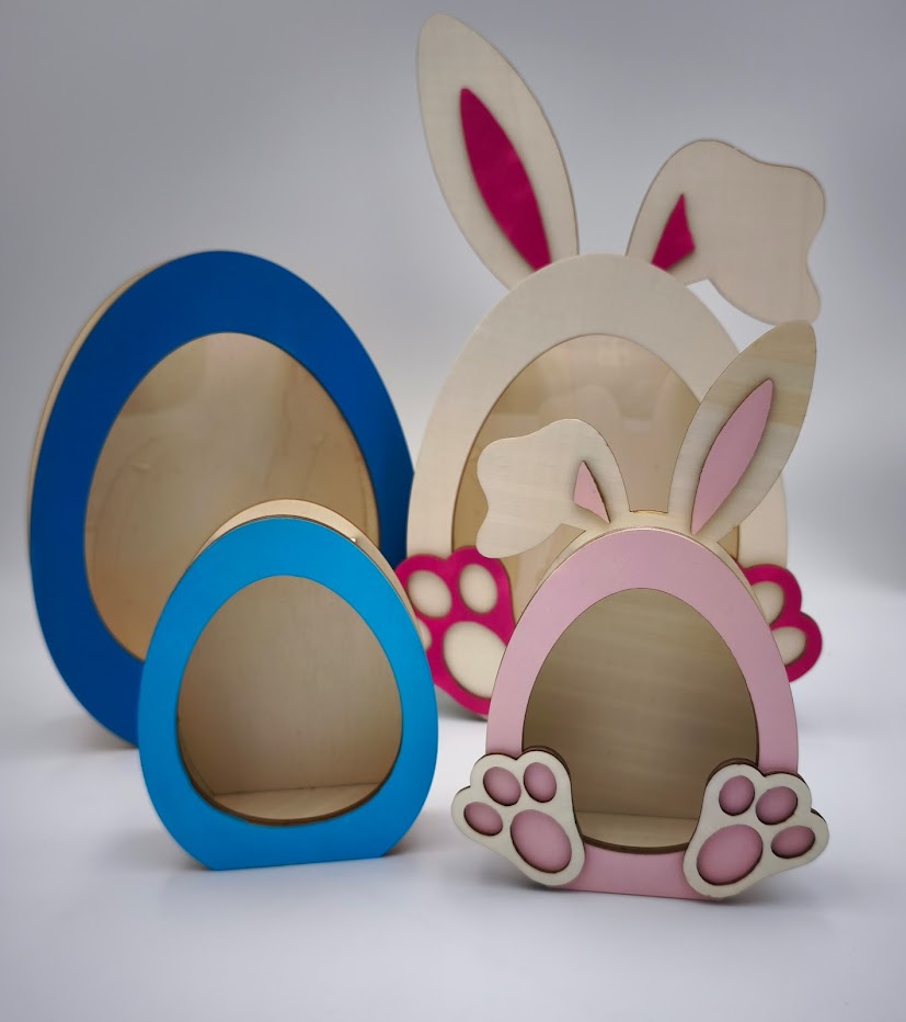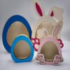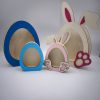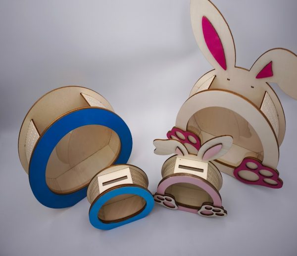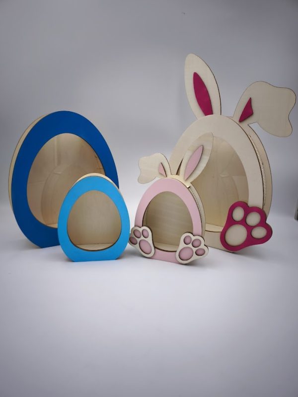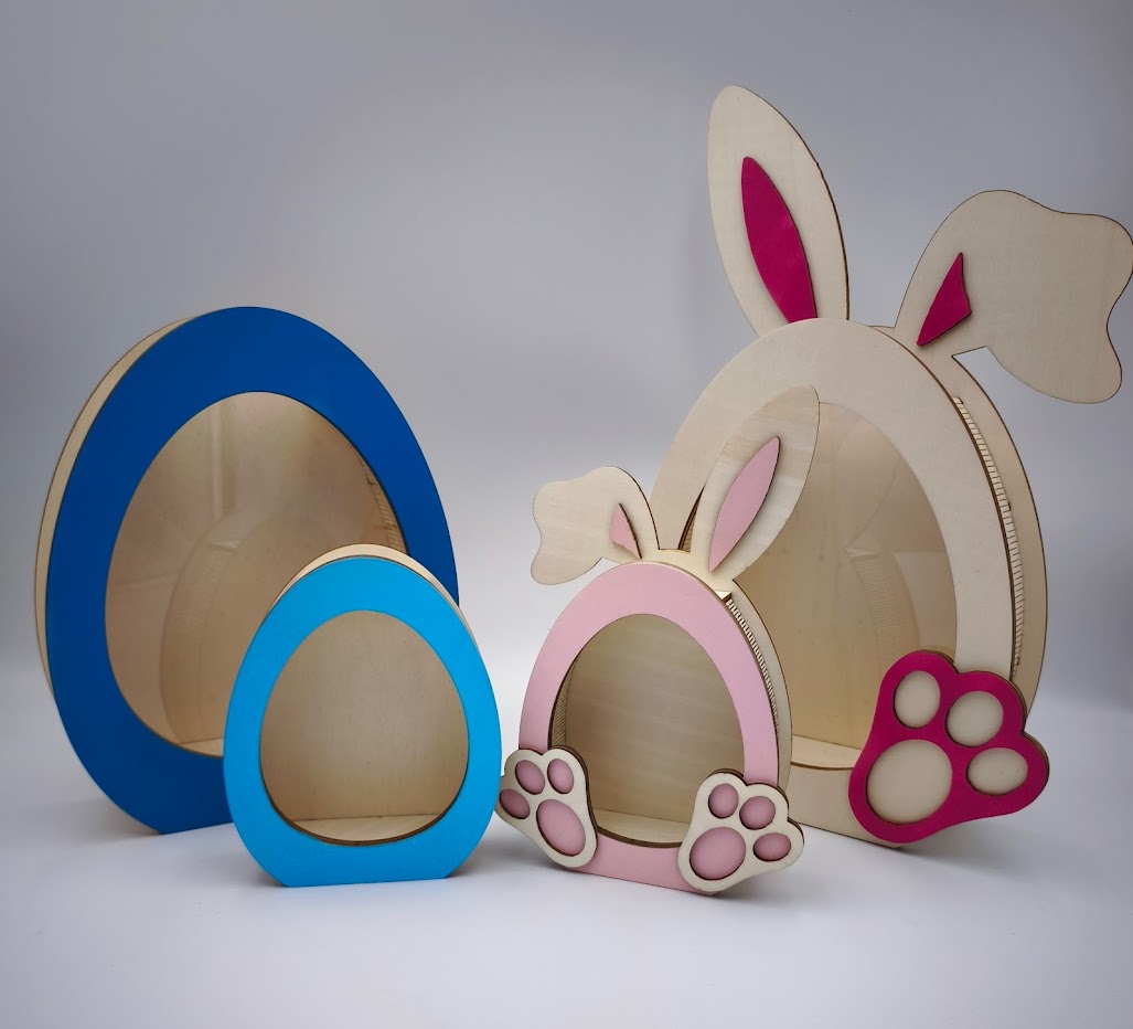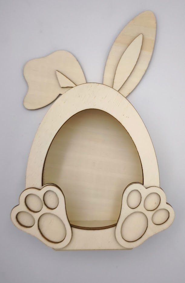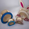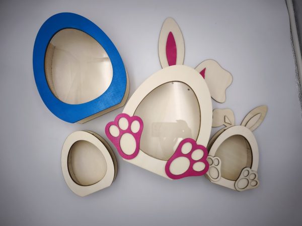 Varázsolja el gyermekeit vagy unokáit ezzel a látványos, fából készült húsvéti nyuszival! A 39 cm (a fülek nélkül 26 cm), a kicsi nyúl 23 tojás 15 cm magas figura nemcsak dísz, hanem egy ötletes csokoládétartó is. A 3 mm-es rétegelt lemezből készült nyuszi egyedi névvel kérhető, (max 20 karakter, ha ennél többet szeretne, vegye fel velünk a kapcsolatot) így válik igazán személyes ajándékká.