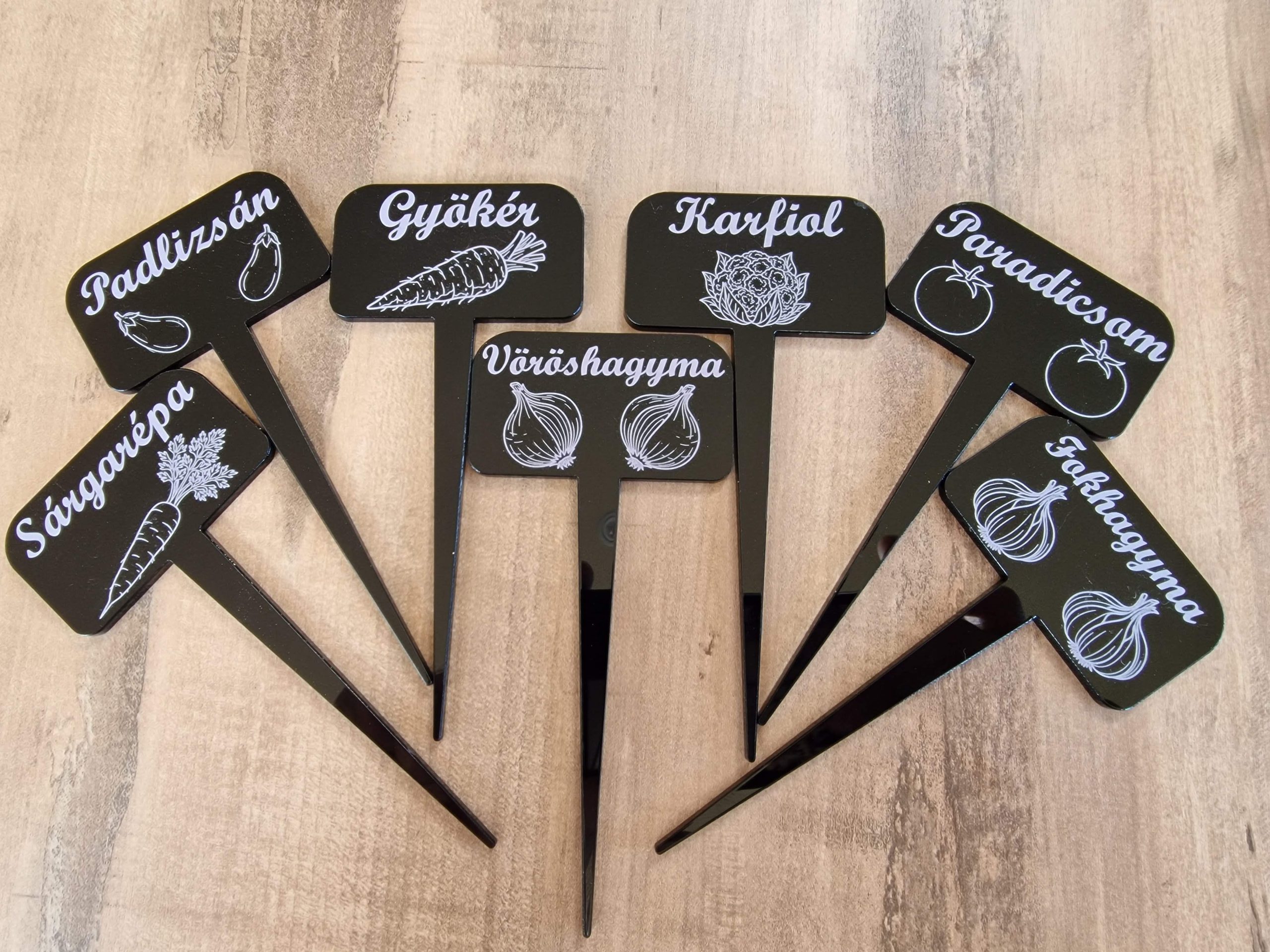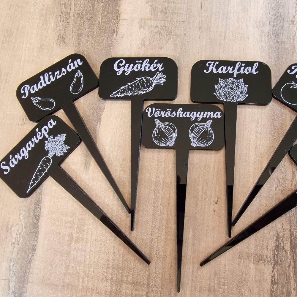 Tegye átláthatóvá és stílusossá kertjét vagy fűszerkertjét ezekkel a 13 cm magas, prémium minőségű akril növényjelölőkkel! Az UV-álló anyag garantálja, hogy a jelölők a tűző napon sem sárgulnak be vagy válnak törékennyé. A fekete kivitelben kérhető táblácskákra egyedi gravírozással kerülnek fel a növénynevek, így az írás sosem kopik le.
