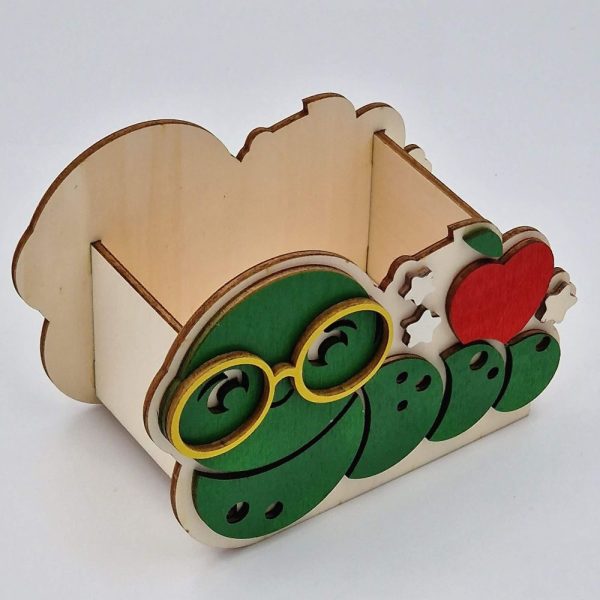- Anyaga és minősége: A tolltartó 3 mm vastag rétegelt lemezből készül, ami stabil és tartós. A bonyolult formákat és a részleteket a legmodernebb, füstmentes lézeres vágással és minőségi lézergravírozással készítjük. A több rétegű és színes elemek (a hernyó feje, a piros alma) extra 3D hatást keltenek, és kiemelik a figura vidámságát.