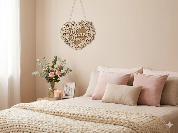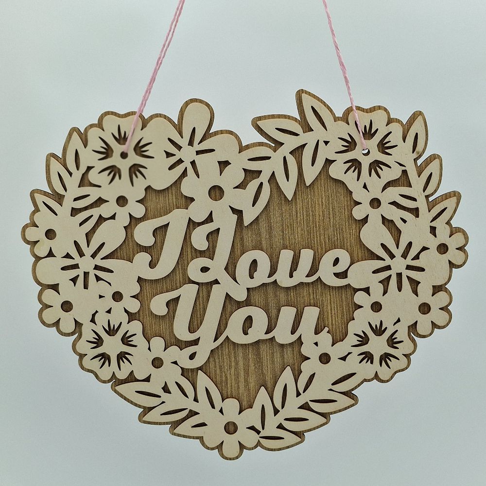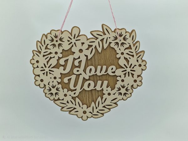 Mondd el érzéseidet ezzel a gyönyörű, virágmotívumokkal díszített fa szívvel! A 3 mm-es rétegelt lemezből készült, kb. 31×26 cm-es fali dísz közepén az „I Love You” felirat olvasható. A precíz, füstmentes lézervágás és a kétrétegű hatás elegáns megjelenést kölcsönöz neki. Rózsaszín zsineggel azonnal felakasztható. Tökéletes romantikus ajándék!