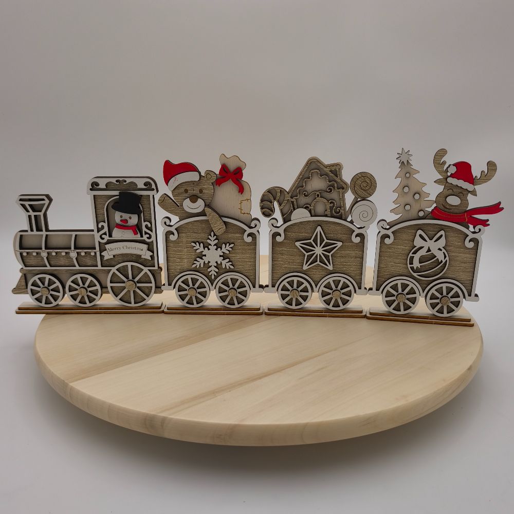 Hozd el a karácsonyi hangulatot ezzel a varázslatos, fából készült kisvonattal! A 40×14 cm-es dekoráció mozdonyból és három, ajándékokkal teli kocsiból áll, melyeket hóember, plüssmaci, mézeskalács és rénszarvas díszít. A 3 mm rétegelt lemezből, precíz lézeres vágással és gravírozással készült termék tökéletes asztali dísz vagy ajándék.