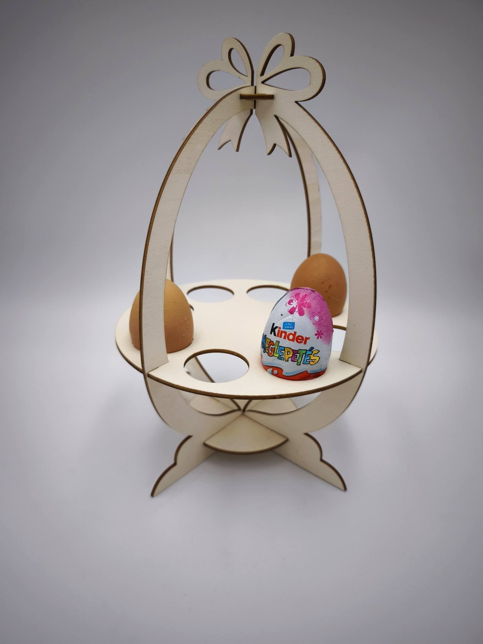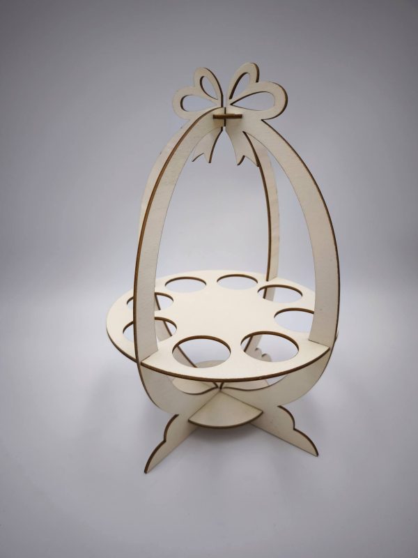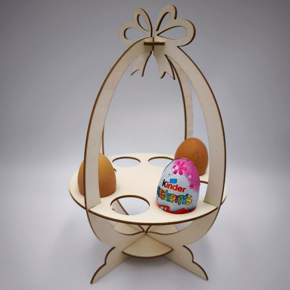 Elegáns, fából készült húsvéti tojástartó 8 tojás számára. A 3 mm-es rétegelt lemezből készült díszt egy gyönyörű, finoman vágott masni koronázza meg. A füstmentes, precíz lézervágásnak köszönhetően az élek tökéletesen tiszták, nincsenek csúnya égésnyomok, a minőségi lézergravírozás pedig aprólékos részletekkel díszíti a fát. Tökéletes asztali dísz vagy kreatív ajándék. A tojások nem tartozékok.