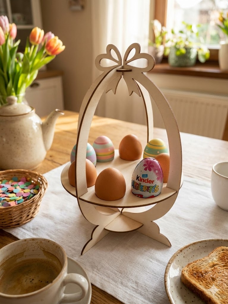 Vigyen természetes bájt és kézműves eleganciát az idei Húsvétba ezzel a különleges, fából készült tojástartóval! Ez a termék a precíz mérnöki munka és a művészet találkozása, amely minden részletében az ünnep hangulatát hordozza.