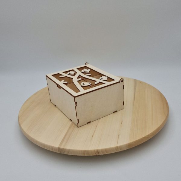 Ez a stílusos Nyitható dobozka 3 mm-es rétegelt lemezből készült, precíz lézervágással és füstmentes lézergravírozással. Különlegességét a tetején található ágas-bogas fa mintázat adja, melybe apró madárkák vannak belevágva. A doboz teteje nyitott, így könnyen hozzáférhetők a benne tárolt tárgyak. Ideális ékszerek, emlékek, vagy apró ajándékok tárolására, de önálló dekorációs elemként is megállja a helyét. Natúr felülete festhető, lakkozható, így teljesen személyre szabható.