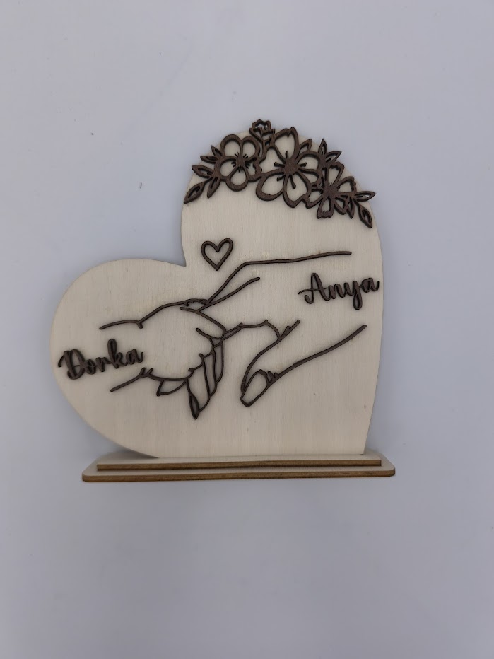 Ez a szív alakú, rétegelt lemezből készült asztali dísz a szülő és gyermek közötti végtelen szeretetet szimbolizálja. A minőségi lézergravírozással készült „kéz a kézben” motívumba egyedi nevek és feliratok kérhetőek, így válik a termék tökéletes és személyes ajándékká anyák napjára, születésnapra vagy bármilyen családi ünnepre.