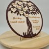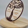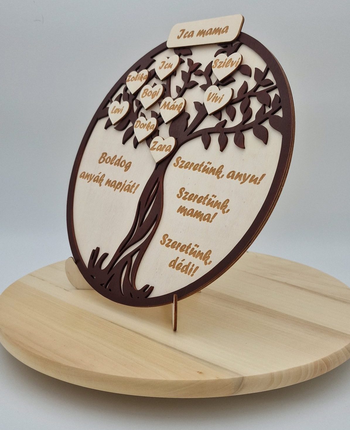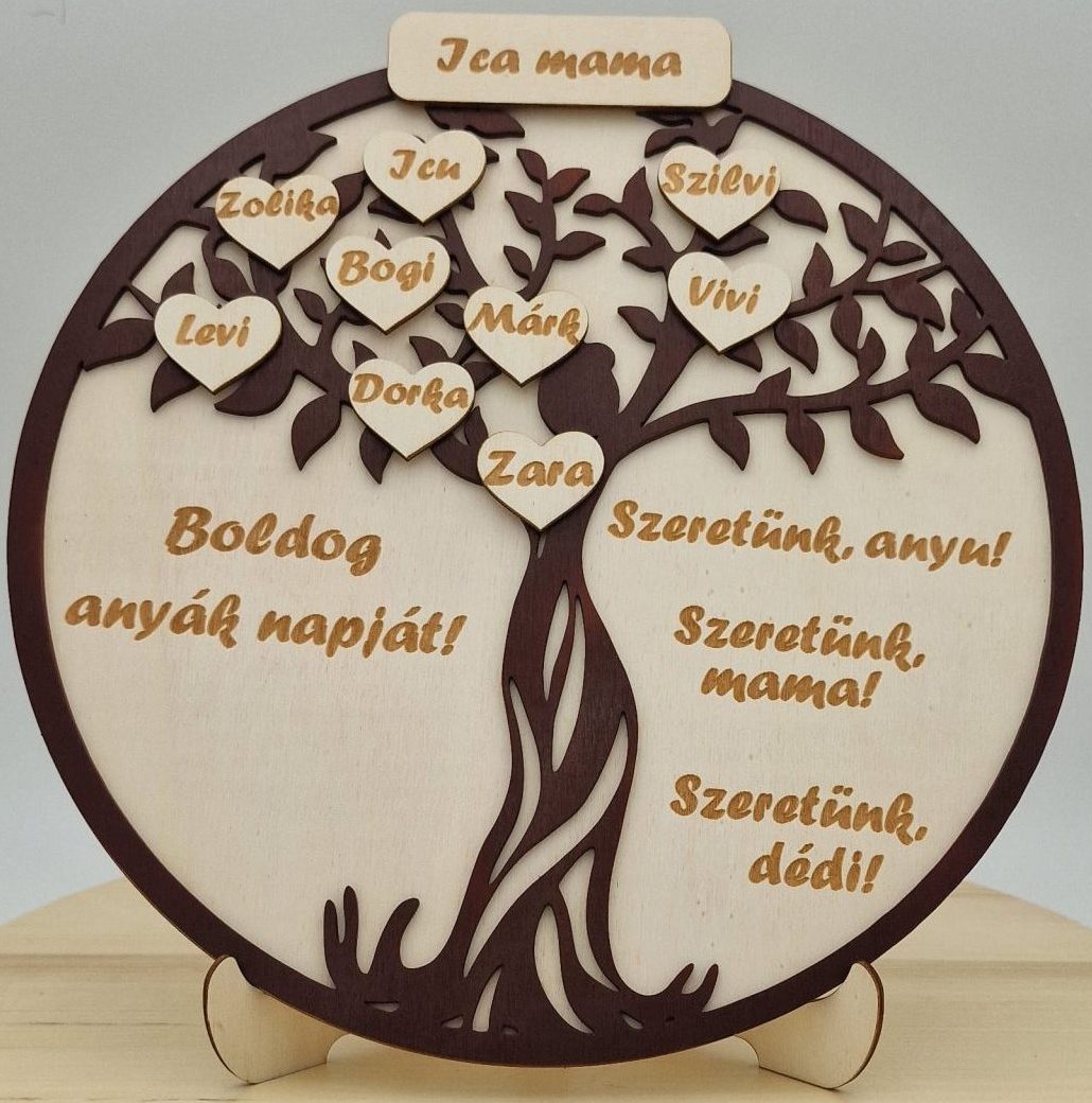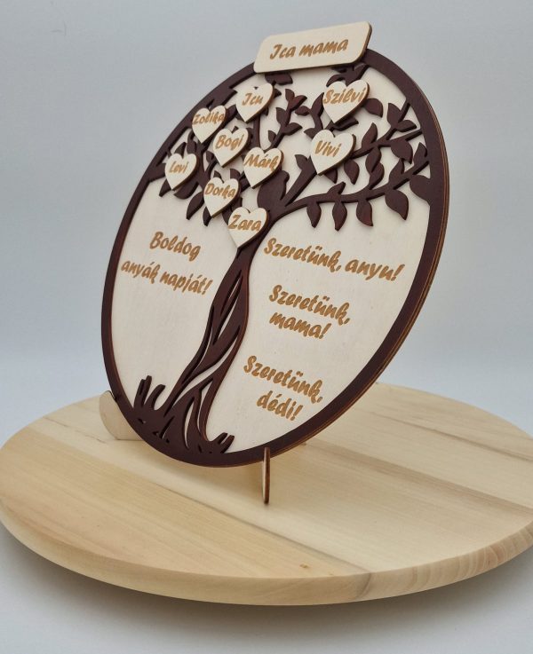 Elegáns és egyedi családfa dísz, mely 3 mm vastag rétegelt lemezből készül. A mérete kb 30×30 cm-es, tartó állvánnyal együtt készítjük, személyre szabható nevek és feliratok, több választható színben rendelhető (az alap és a szívek natúr lézergravírozott, a fa forma festett).