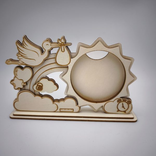 Varázsolja el a babaszobát ezzel a 3 mm-es rétegelt lemezből készült, különleges szivárványos és gólyás képkerettel! A precíz, füstmentes lézervágással készült asztali dísz a boldogságot hozó gólyát, színes álmokat idéző szivárványt és lufikat ábrázolja. A születési adatokat (idő, súly, méret) a felhőkbe rejtett ikonokba gravírozzuk, a baba nevét pedig az Ön által kért helyen tüntetjük fel. Természetes, szívhez szóló emlék az egész családnak.