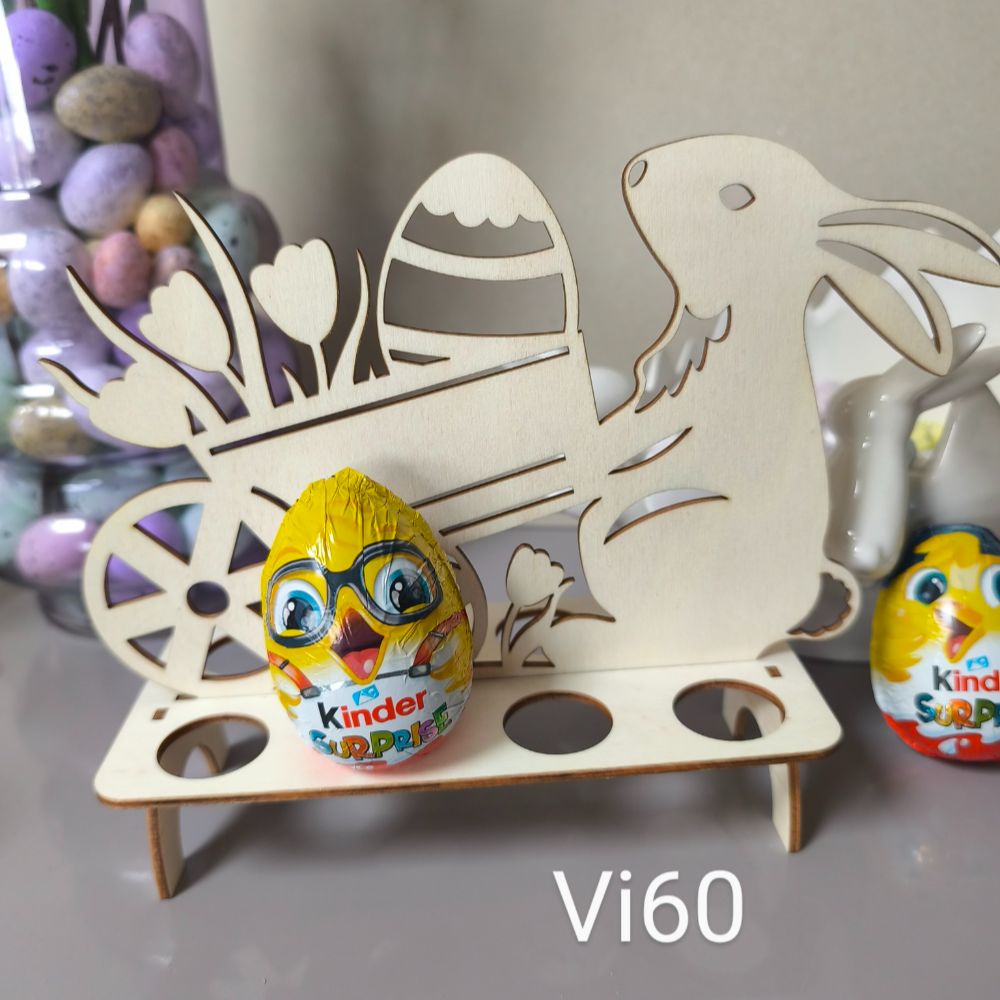 Ez a kedves Tojástartó nyuszi 3 mm-es rétegelt lemezből készült, precíz lézervágással és füstmentes lézergravírozással. A tartó egy nyuszit ábrázol, amely egy kis biciklit tol, amin egy tojás és tulipánok vannak kivágva. Az alapzatán négy kivágott hely található, melyek Kinder tojások vagy más hasonló méretű édességek tárolására ideálisak. Tökéletes húsvéti dekoráció vagy ajándék! A képeken látható tojások nem tartozékai a terméknek.