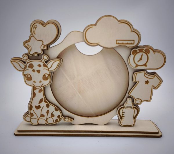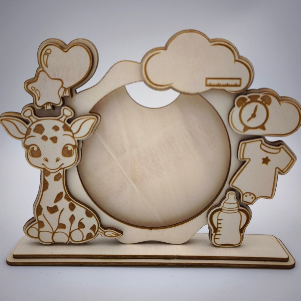 Tegye örökké a születés pillanatát ezzel a bájos, 3 mm-es rétegelt lemezből készült zsiráfos képkerettel! A precíz, füstmentes lézervágással készült asztali díszt lufik, felhők és babaholmik mintái teszik különlegessé. Ez az emlékőr teljesen egyedivé tehető: a gravírozott felhőbe (vonalzó) a baba hossza, az órába a születési idő, a babaruhába pedig a születési súly kerül, a baba nevét pedig az Ön által kért helyre gravírozzuk. Kiváló, személyes ajándék babaszületésre, keresztelőre vagy az első születésnapra, melyet a natúr fa melegsége és a minőségi lézergravírozás tesz igazán egyedivé.